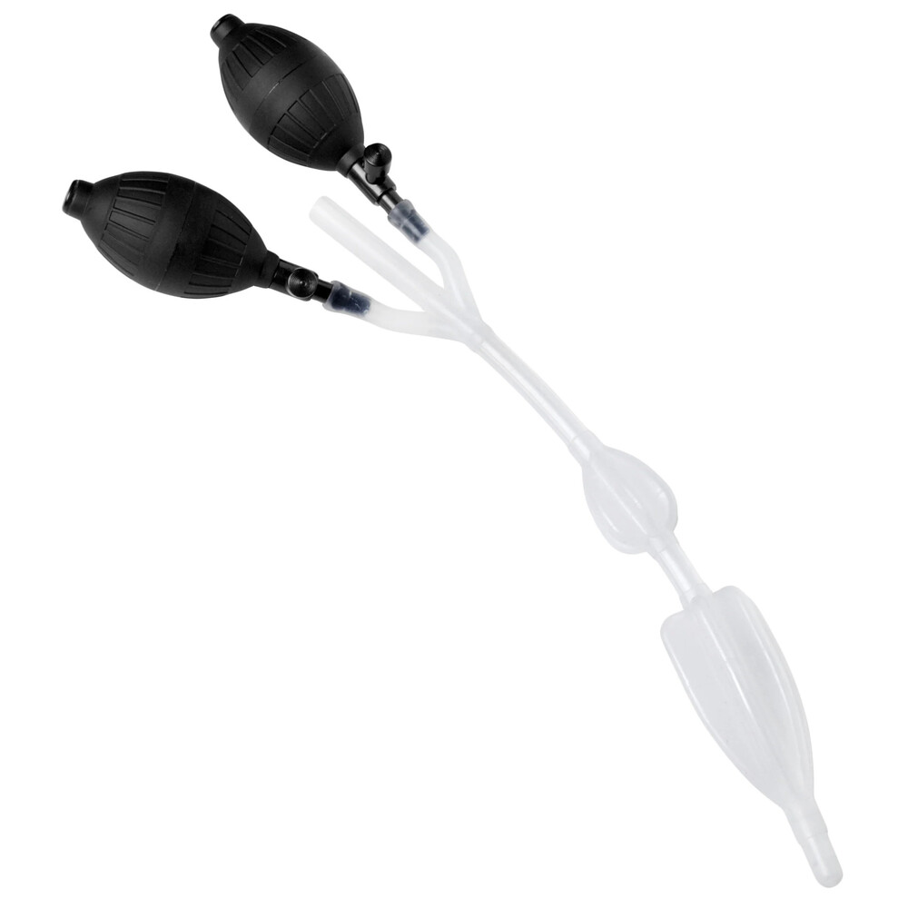 The Silicone Inflatable Double Bulb System is made of premium silicone and is designed for the enema enthusiast. The nozzle is inserted along with the first balloon. Both balloons are then inflated, creating an internal feeling of fullness and an external seal. Once the seal is created, liquid is filled inside of the rectum via a bag system or the Clean Stream In Line Accelerator. The premium silicone is ultra soft yet firm and flexible, for comfortable and body safe use. Each bulb has an integrated release valve for quick deflation and easy removal. Measurements 17.5 inches in total length, Large bulb 5 inches in length, 3 inches max diameter inflated. Small bulb 1.75 inches in length, 2 inches max diameter inflated. Material Silicone, rubber, ABS plasticColor Clear Note Compatible with the Water Bottle Cleansing Kit, Water Bottle Douche Kit, and In Line Accelerator Bulb