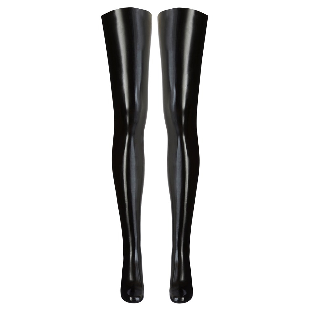 Latex Black Stockings.Skinny, thigh high, dipped latex stockings in black. Without shoes.