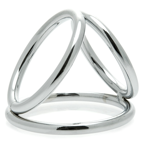The Triad Chamber brings the art of domination in threes. This chrome cock cage features three differently sized O rings with which you can ensnare your pet. The largest ring goes around the cock and balls like a normal cock ring. The middle sized ring goes around the balls, providing the wearer with a pressure sensation. The third ring goes around the base of the penis to help you maintain the kind of erection that lasts for extended sessions. The Triad Chamber is perfect for the experienced user who wants a sleek and modern look, but seeks a weighted, more supportive cock ring. MeasurementsFirst Ring 1.2 Inches (Diameter 3.7 Inches CircumferenceSecond Ring 1.4 Inches (Diameter 4.4 Inches CircumferenceThird Ring 1.75 Inches (Diameter 5.9 Inches Circumference