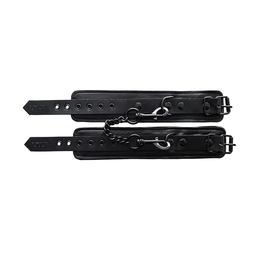 An exquisite pair of 100% leather wrist cuffs. Fully adjustable buckle straps. Comes with a detachable double-trigger hook chain connecting to a D-Ring. All black with black Accessories.