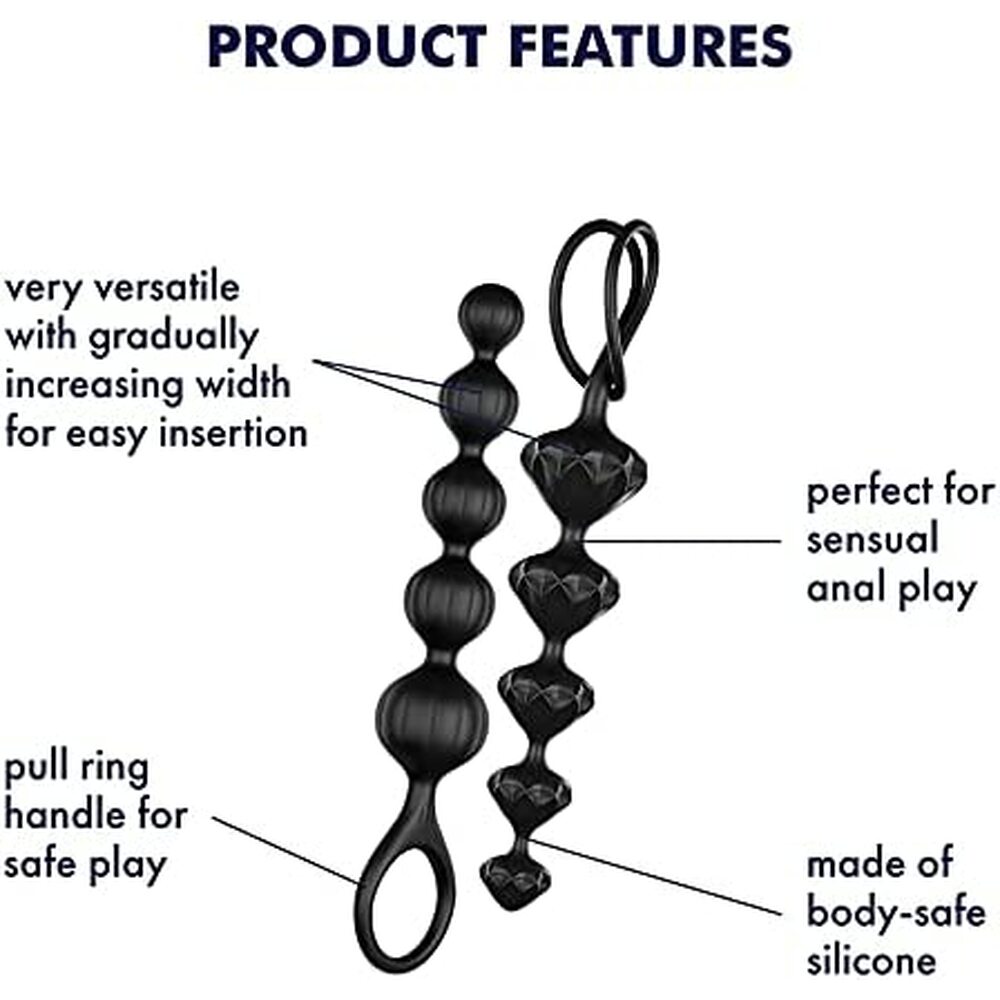 Coming in two different shapes, the new Satisfyer Beads are made from luxurious silicone with an easy glide surface. 2 playful designs with a delicate surface in skin-friendly super-soft silicone flatter your back passage for a, particularly friction-free in-and-out. Whether you opt for the classic ball shape or dare to try out the pyramid-shaped structure in a high-quality diamond look is entirely up to you.Thanks to their ascending structure and rounded tips, the 5-element chains are ideal for beginners and well-advanced explorers. The Satisfyer Beads are the ideal companion for adventurous and experimental users. A solid loop at the end of the chain also provides a secure hold during sensual anal adventures.The anal bead chain is made from silky smooth, medical-grade silicone. The toy can be easily cleaned with lukewarm water and a little soap. Finish off with a couple of sprays of disinfectant toy cleaner to ensure especially thorough hygiene.