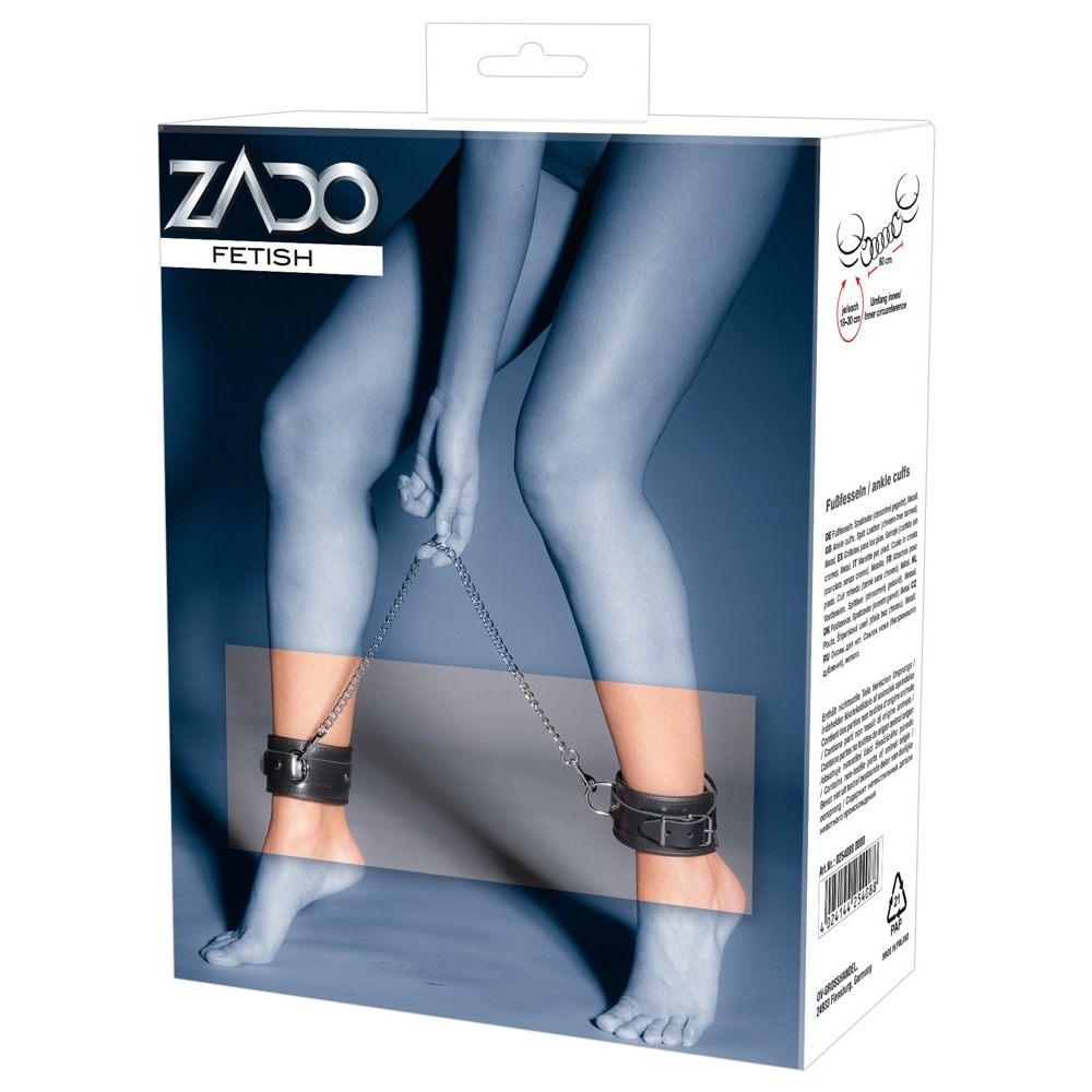 Leather ankle cuffs, padded and edge-trimmed. Connected by heavy-duty curb chromed curb chain.